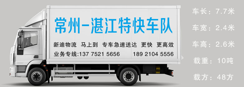 | 常州到湛江貨車:7.7米長×2.4米寬×2.6米高 | 常州到湛江7.7米貨車載重:10T /方數(shù):≈48方 | 常州到湛江專車運(yùn)輸業(yè)務(wù):13775215656 |